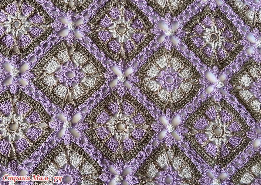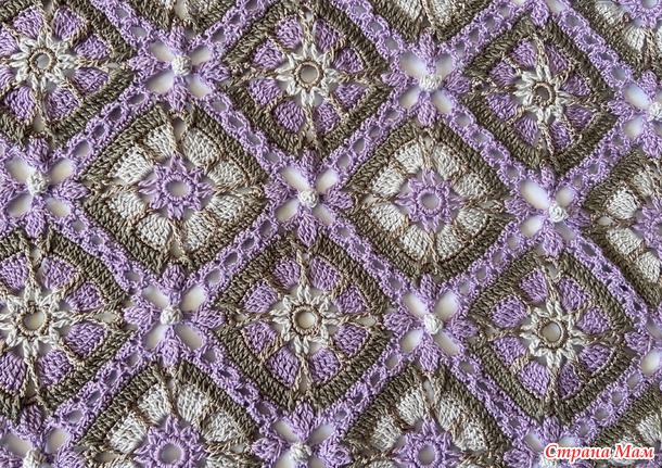 Соединительный ряд -в углах три столбика с двумя накидами в одну вершину и три воздушные петли, закреп, воздушная петля, три столбика без накида, три воздушные, еще 5 повторов, одна воздушная петля и опять 3 столбика с двумя накидами вместе, 3 воздушные закреп в вершине. Мотив стороной 7,5 см.