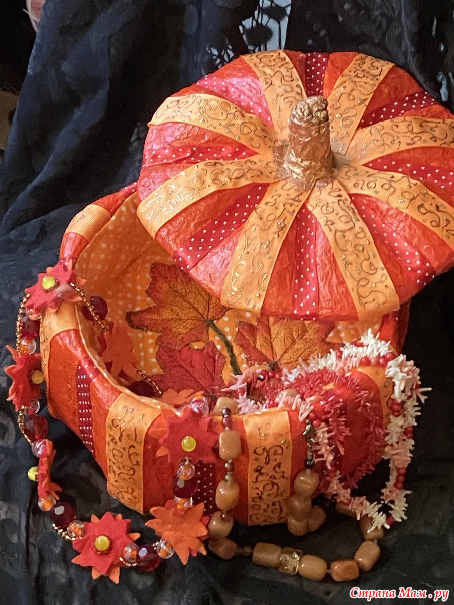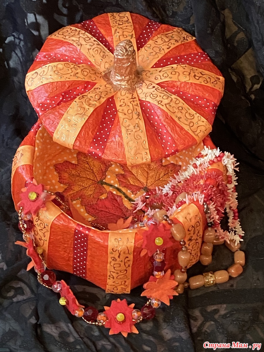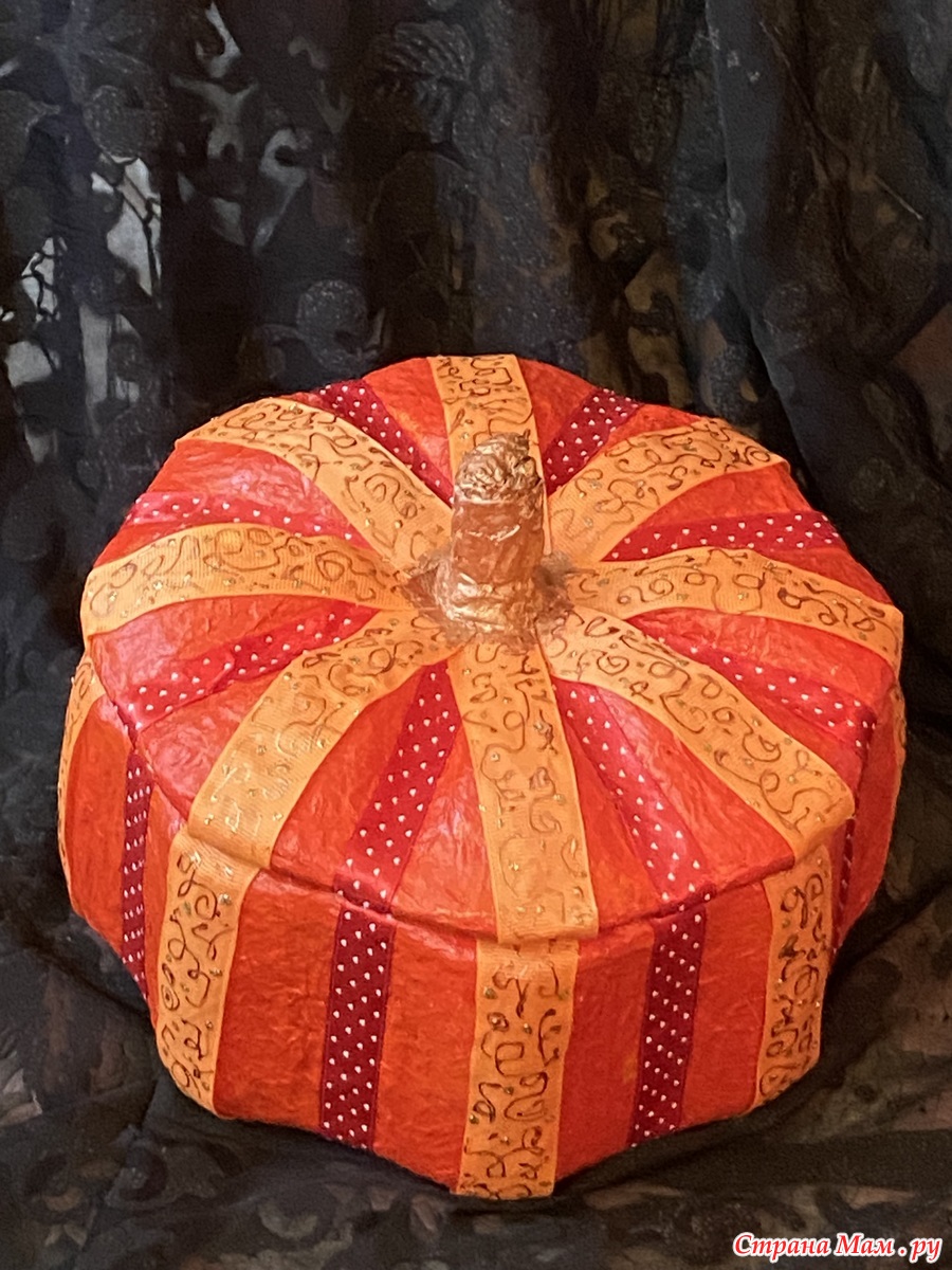 Готовую тыквообразную шкатулку окрашиваем в оттенки яркого оранжевого цвета. Правда, похоже на настоящую?