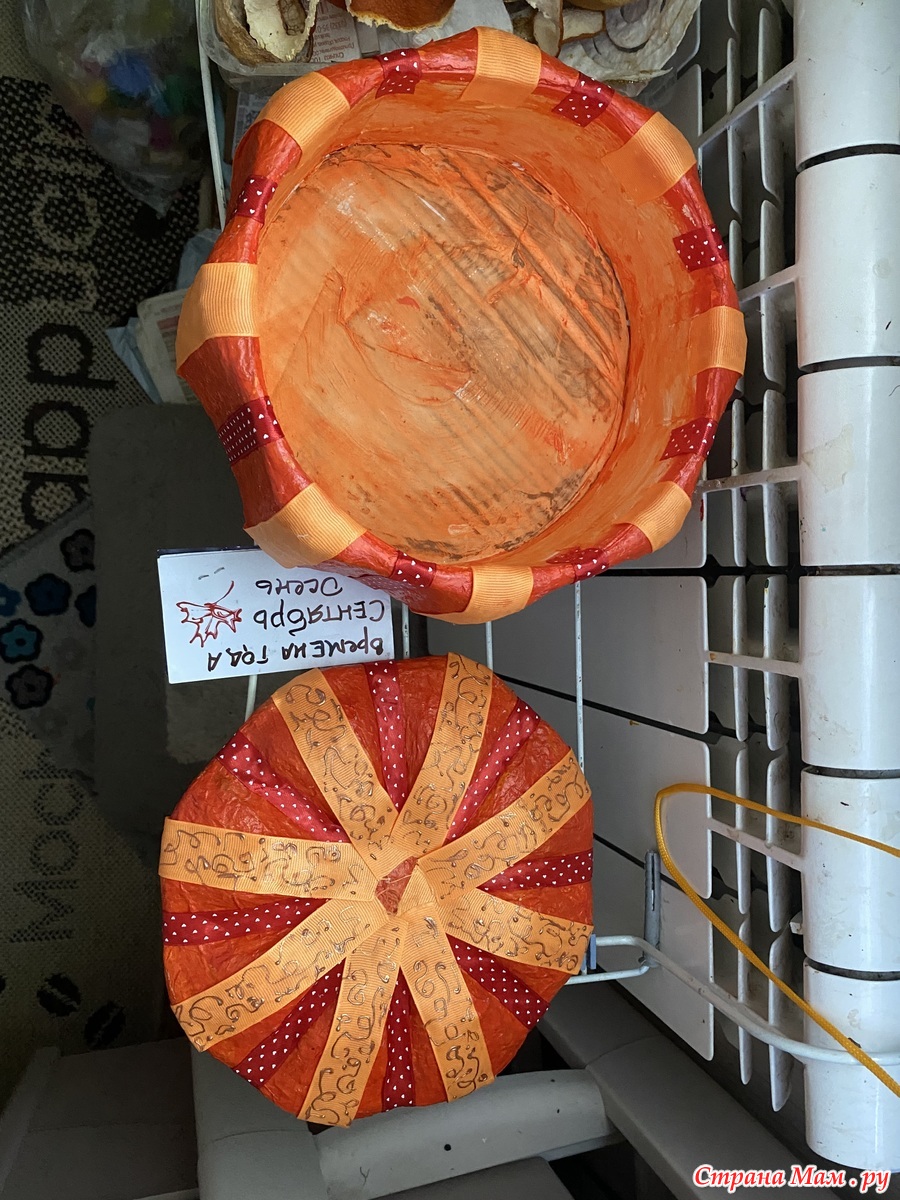 Опять сушим и дальше декорируем. Я использовала оранжевую репсовую ленту, и красную в белый горох атласную.