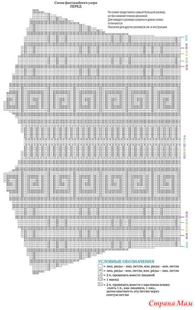 Вязать, как спинку, но в соответствии со схемой фантазийного узора для переда и с более глубоким вырезом горловины.