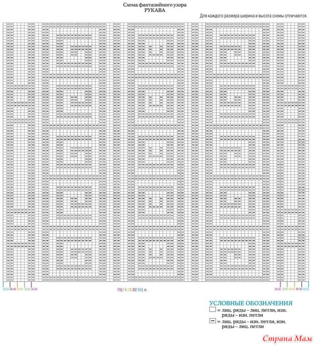 Перейти на спицы № 4,5 и продолжить вязать фантазийным узором согласно схеме для рукавов, в 1-м р. равномерно прибавить 4 п. = 70 (74:78:82:86) п.