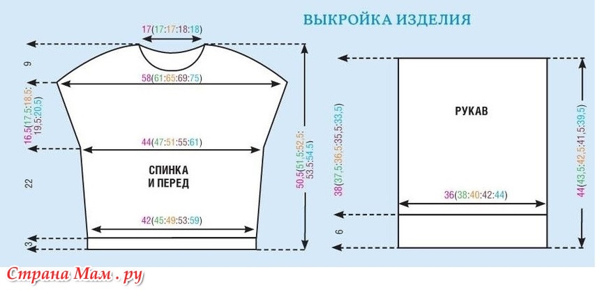 Через 48,5 (49,5:50,5:51,5:52,5) см от начального ряда закрыть для горловины средние 20 (20:20:22:22) п. и далее обе стороны вязать раздельно.