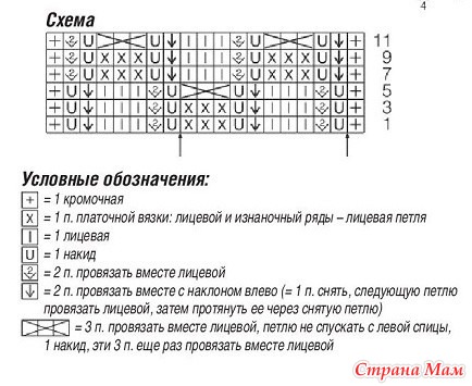 Узор 3. ажурный узор (число петель кратно 10 + 7 + 2 кромочные). Вязать по схеме. На ней даны только лицевые ряды; в изнаночных рядах петли провязывать по рисунку или по условным обозначениям, накиды провязывать изнаночными. Начать с петли перед правой стрелкой, постоянно повторять раппорт из 10 п. между стрелками и закончить петлями после левой стрелки. Постоянно повторять 1-12-й р.