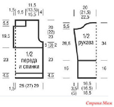 Через 25 см = 78 р. от смены узора закрыть оставшиеся 99 (109) 119 п., из них средние 45 п. образуют горловину, внешние по 27 (32) 37 п. — плечи.