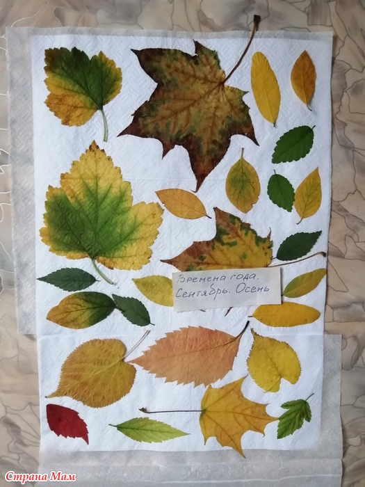 Прежде чем ламинировать, нужно просушить листики. Можно сушить обычным способом (в книжку уложить под пресс на несколько дней), но мне нужно здесь и сейчас. Поэтому я сушила утюгом. Делается просто: берём лист офисной бумаги, сверху салфетку, а затем выкладываем листочки