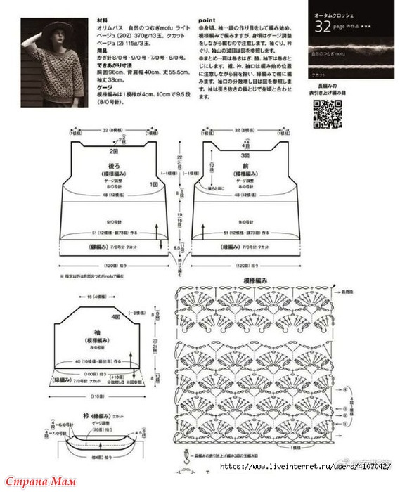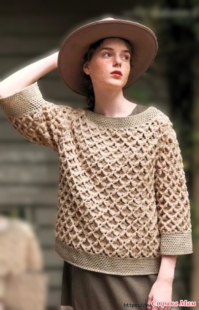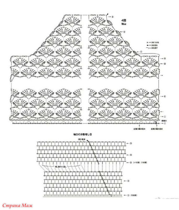 Тело, рукава... Начните с набора воздушной петли и провяжите узор, но будьте внимательны, так как плотность вязания будет меняться по мере вязания тела. Убавки на проймах, горловине и окате рукава указаны на схеме.