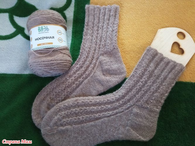 Пряжа для меня новая, вязала из нее впервые. Заявлен метраж 390м, но по ощущениям она тоньше, и какая-то рыхлая. Но носочки получились приятные на ощупь и мягкие. Следующие попробую вязать в 2 нити