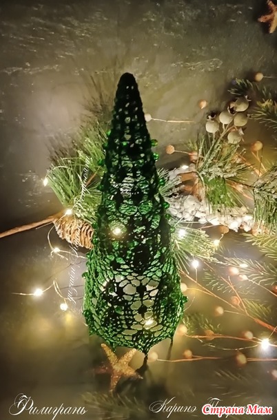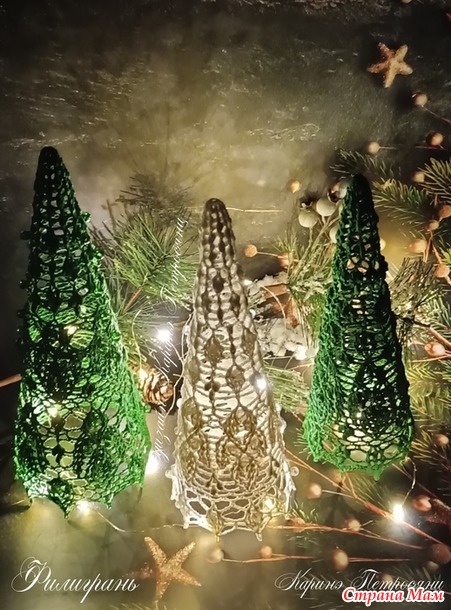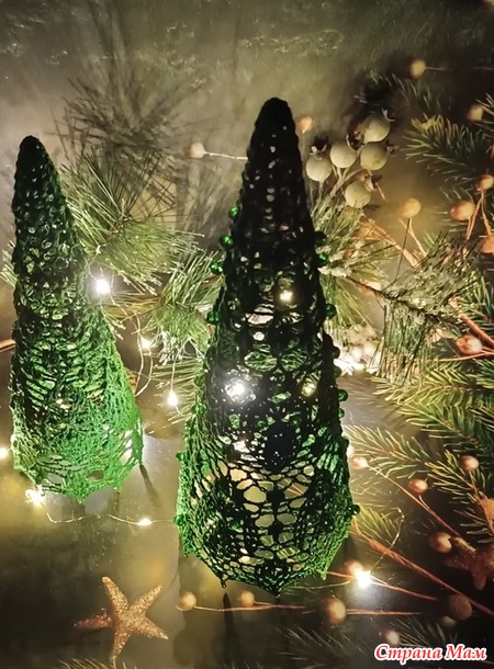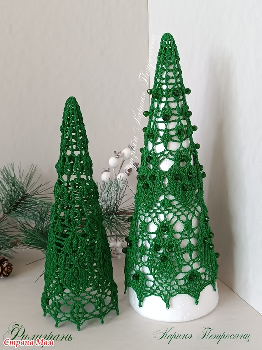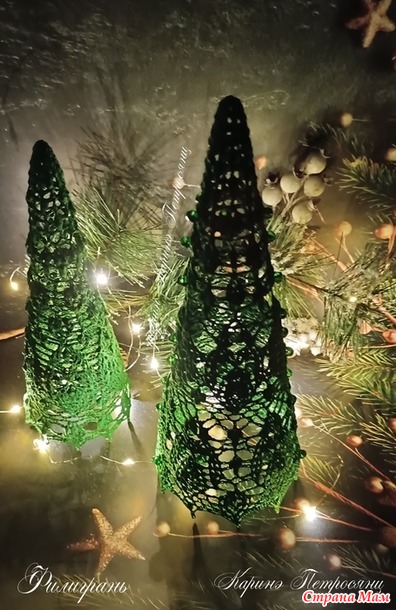 На фото елочки, свзаные из Пехорки ажурной крючком №1.25. Размер 22х7 и 24х9 см, украшены хрустальными бусинами и глиттером в тон.