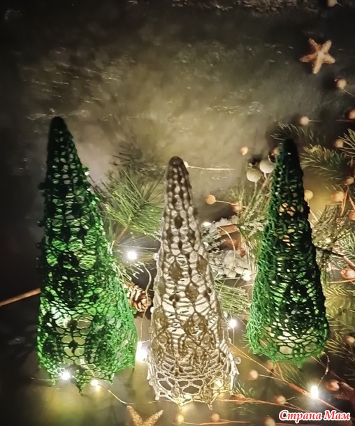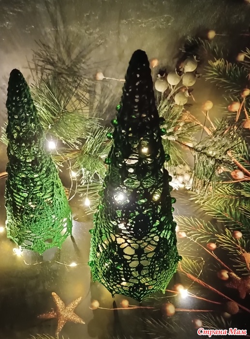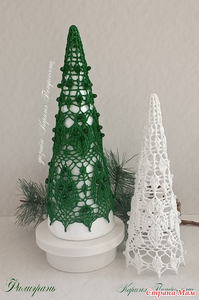 Двигаем ёлки в массы)) На фото елочки, свзаные из Пехорки ажурной крючком №1.25. Размер 22х7 и 24х9 см, украшены хрустальными бусинами и глиттером в тон. Читать полностью