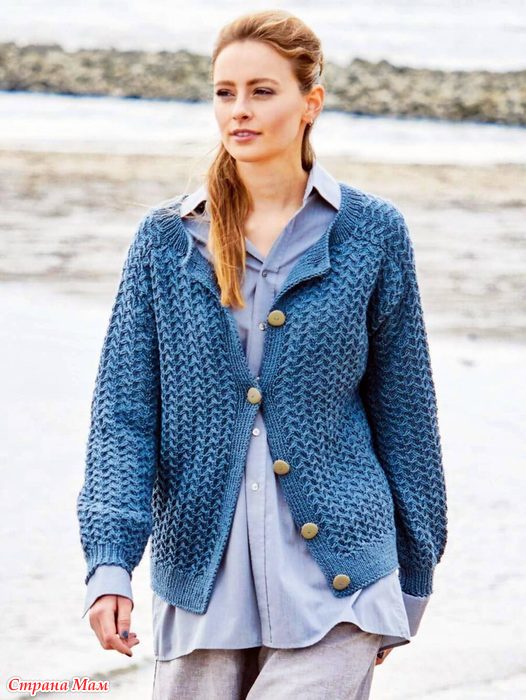 Кардиган на пуговицах с узором «колосок». Спицы.