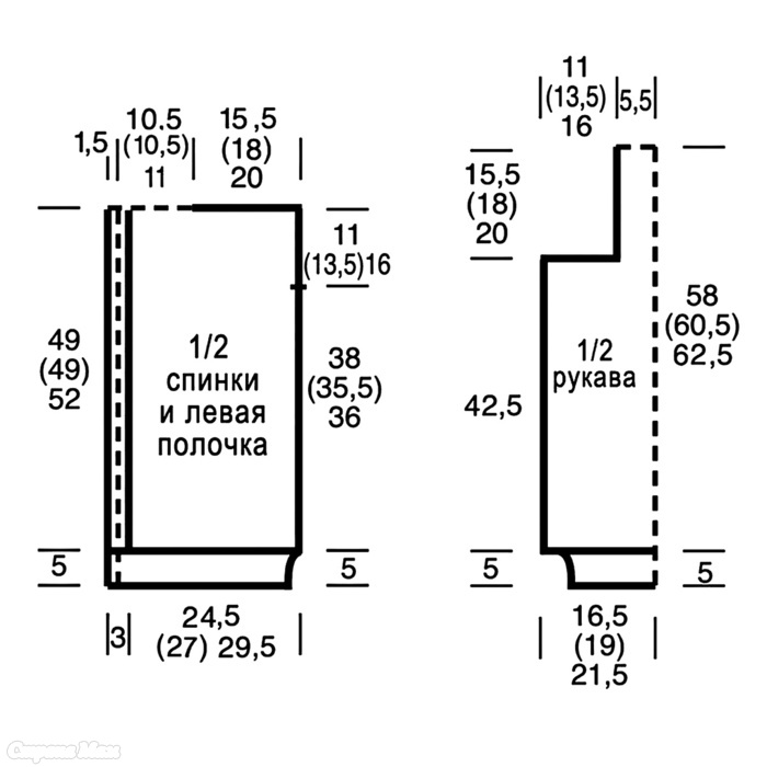 Через 49 см = 128 р. (49 см = 128 р.) 52 см = 136 р. от нижней планки закрыть для плеча 40 (47) 52 п. и отложить оставшиеся 35 (35) 37 п.