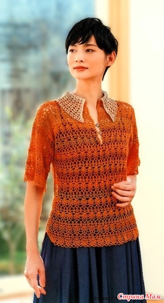 Ажурный пуловер с отложным воротничком поло и закругленными передом и спинкой. Крючок.