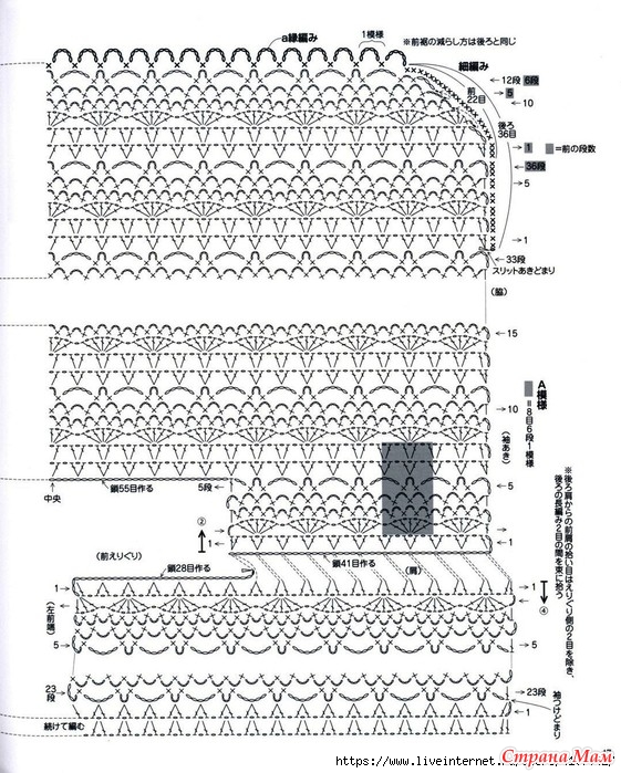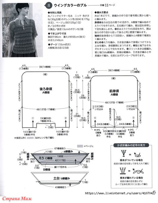 Ажурный пуловер с отложным воротничком поло и закругленными передом и спинкой. Крючок.