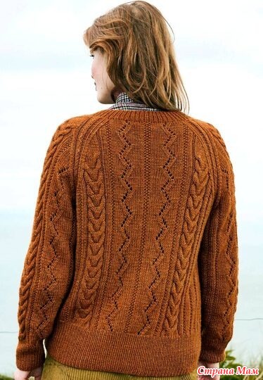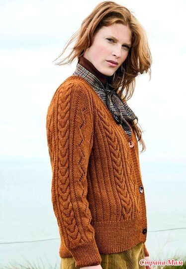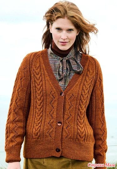 Кардиган реглан с коллажем узоров из «кос» и ажурных зигзагов. Спицы.