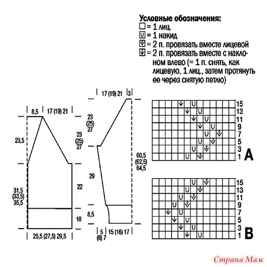 Правая полочка. Вязать симметрично левой полочке ажурным узором В.