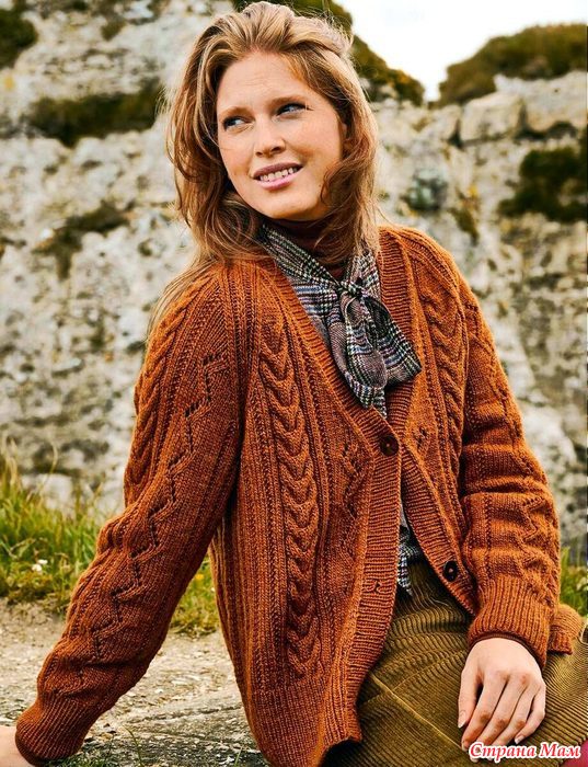 Кардиган реглан с коллажем узоров из «кос» и ажурных зигзагов. Спицы.