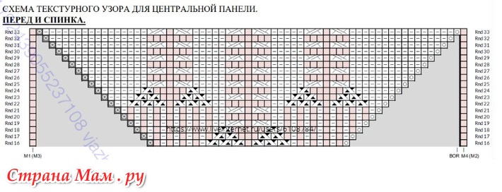 В этом проекте очень важно попасть в заданную плотность вязания резинки 1 х 1, особенно в растянутом виде. Растянутая резинка будет располагаться на плечах, и важно, чтобы ее ширина была правильной. Для лучшего результата можно проверить плотность вязания, выполнив образец узором из резинки по СХЕМЕ для боковых сторон (вяжите образец по СХЕМЕ, где указаны петли между маркерами М2 и М3).