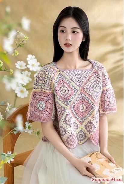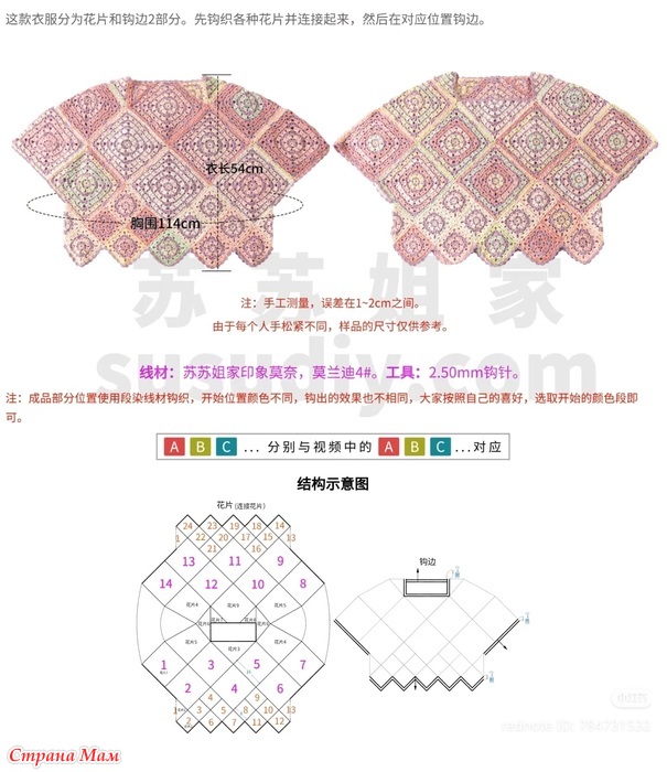 Этот джемпер разделен на две части: цветочные детали и края, связанные крючком. Сначала свяжите крючком несколько цветочных деталей и соедините их, а затем обвяжите края в соответствующих местах.