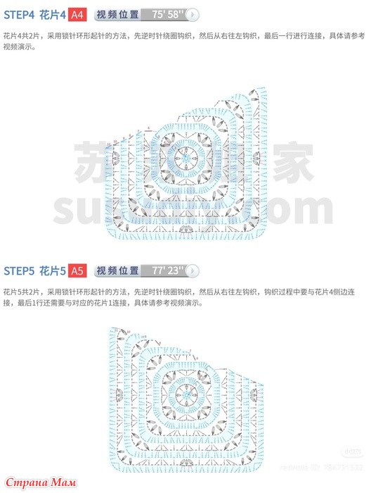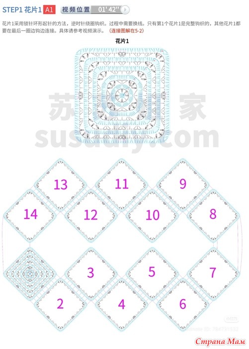 Наберите первую деталь цепным столбиком, провязывая против часовой стрелки. По мере выполнения нити нужно менять. Полностью провязывается только первая деталь; остальные детали соединяются по мере провязывания последней петли. Подробности смотрите в видео. (Схема соединения в 5-2)