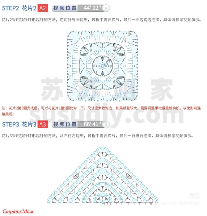 Цветок 2 выполняется методом замковой спицы и кругового начала, крючком по кругу против часовой стрелки. Нить необходимо менять в процессе вязания, а последний круг соединяется в процессе вязания. Подробности смотрите в видеодемонстрации.