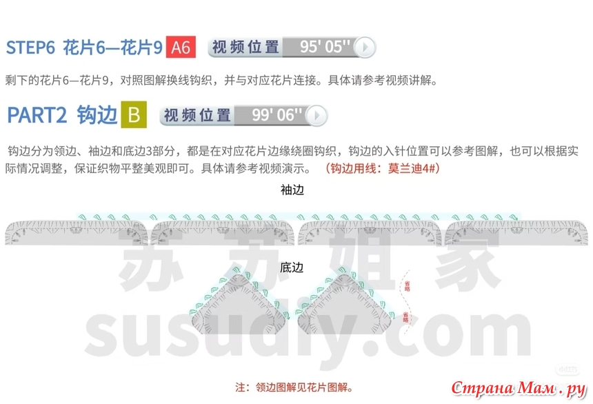 Вязаный край крючком делится на три части: край воротника, край рукава и нижний край. Каждая часть вяжется крючком по краю соответствующего цветка. Положение иглы в вязаном крае можно регулировать по схеме или в зависимости от ситуации, чтобы полотно получилось гладким и красивым. Подробности смотрите в видеодемонстрации.