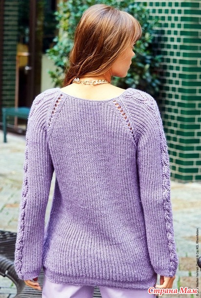 Джемпер с ажурными полосами на рукавах реглан. Спицы.