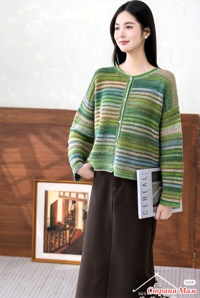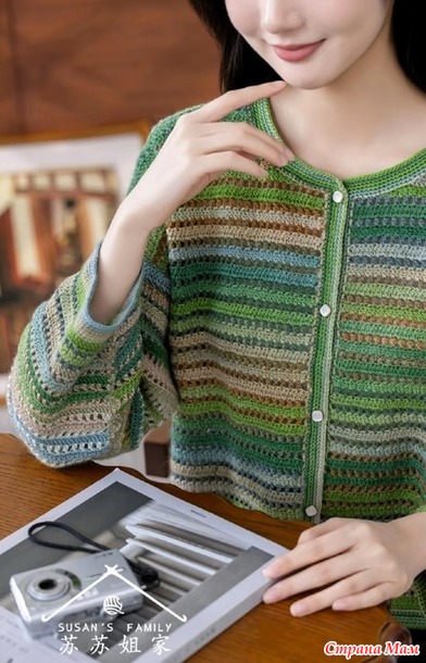 Кардиган состоит из правой полочки, левой полочки, спинки, рукавов, манжет, общей застежки на крючки и пуговиц.
