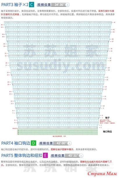 Вязаный край манжеты выполняется против часовой стрелки от начала рукава. Схема показана на схеме рукава. Подробности смотрите в видеодемонстрации.