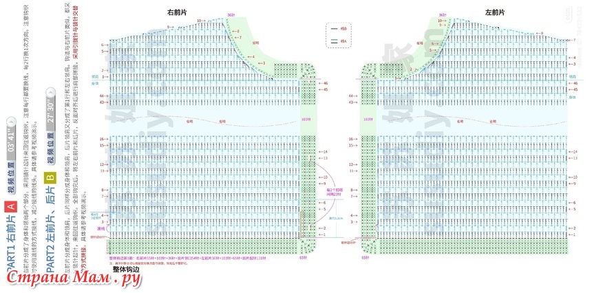 Общая петля вяжется против часовой стрелки по краям левой и правой передних и спиночных деталей после их соединения. Схемы вязания показаны на схемах для левой и правой передних и спиночных деталей. После того, как вся петля будет выполнена, выровняйте общую петлю. В третью петлю, соответствующую петле, пришейте пуговицу крючком.