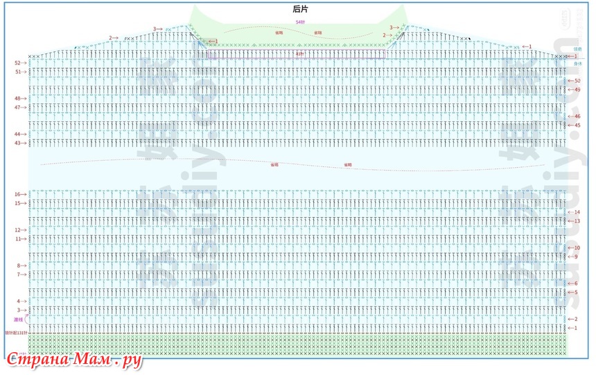 1-й круг вязания крючком: 55 петель + 103 петли + 36 петель для правой полочки + 54 петли для выреза горловины спинки + 36 петель + 103 петли + 65 петель для левой полочки + 131 петля для спинки