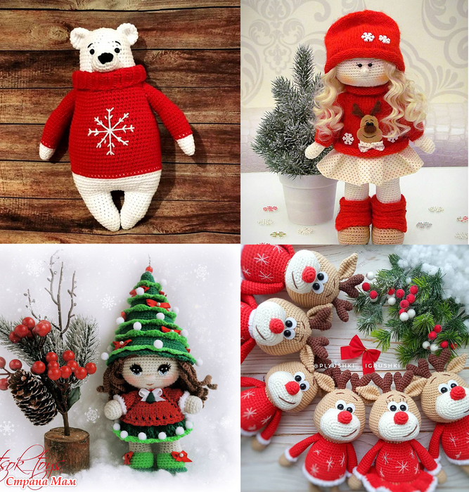 Или игрушки в новогодних костюмах: в красных колпачках, в свитерочках с вышивкой/аппликацией снежинок, рождественских оленей, снеговиков...