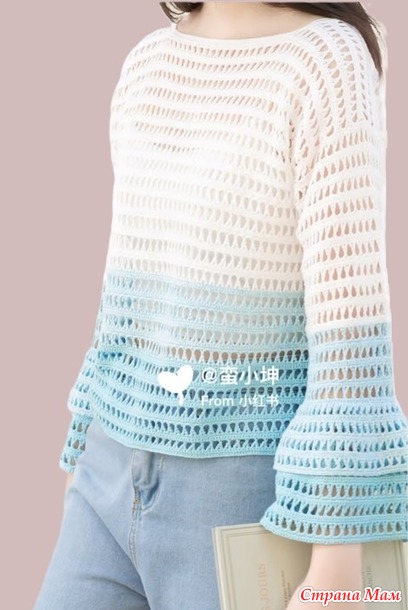 Ажурный пуловер из пряжи с градиентом и расклешенными рукавами.
