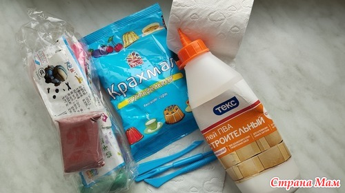 Приготовление: В миску вылить клей, в клей поочередно вмешивать туал.бумагу до получения плотной массы, затем добавить моющее ср-во и масло, всыпать крахмал. Затем добавить 1/2 части муки и начать вымешивать массу. На стол высыпать оставшуюся муку, выложить массу из мисочки и вымесить до гладкости на столе, как тесто на пельмени.