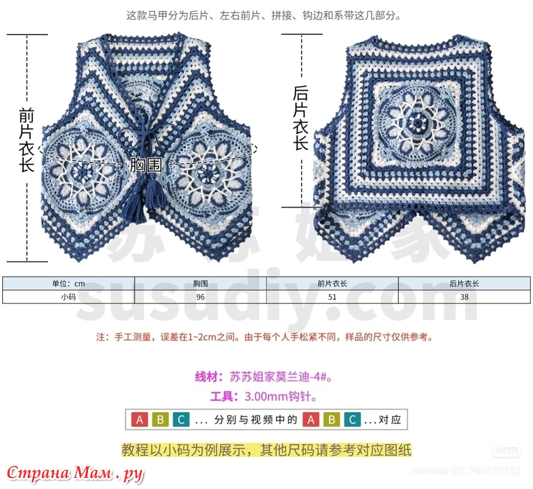 Жилет состоит из спинки, левой и правой передних частей, сращивания, крючков и шнурков.