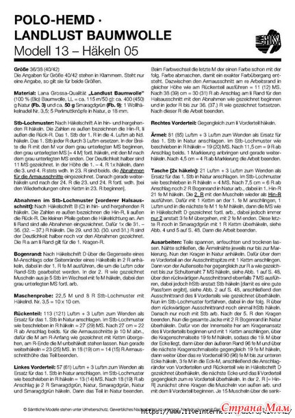 Материал: качественный хлопок Landlust от Lana Grossa (100% (органический) хлопок, LL = ок. 115 м/50 г): ок. 400 (450) г натурального цвета (цвет 3) и ок. 50 г изумрудно-зеленого цвета (цвет 9); 1 крючок для шерсти № 3,5; 5 перламутровых пуговиц натурального цвета, Ø 18 мм.