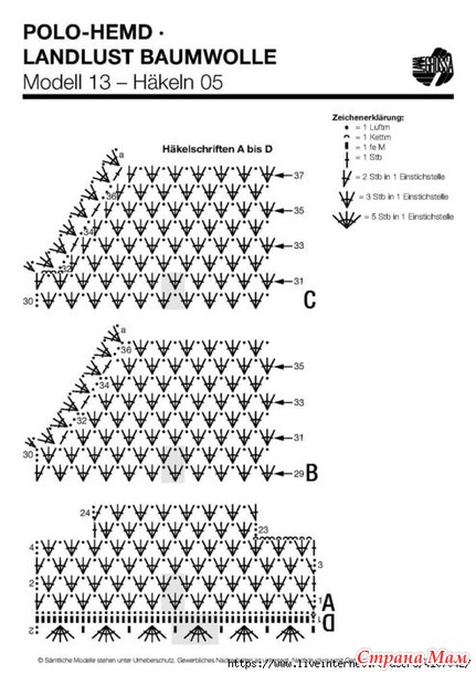 Убавки в узоре для ажурного узора гладью (вырез горловины переда): вяжите крючком по схеме B (C) рядами в прямом и обратном направлении. Цифры на внешней правой стороне обозначают лицевой ряд, на внешней левой стороне – изнаночный ряд. Маленькие стрелки указывают направление вязания. Все убавки отмечены на краю. Для этого провяжите 31-й, 36-й (32-й–37-й) ряды один раз. 29-й и 30-й (30-й и 31-й) ряды изображены перед убавками для наглядности. Обозначение «r» на левом краю относится к 1-му ряду воротника.