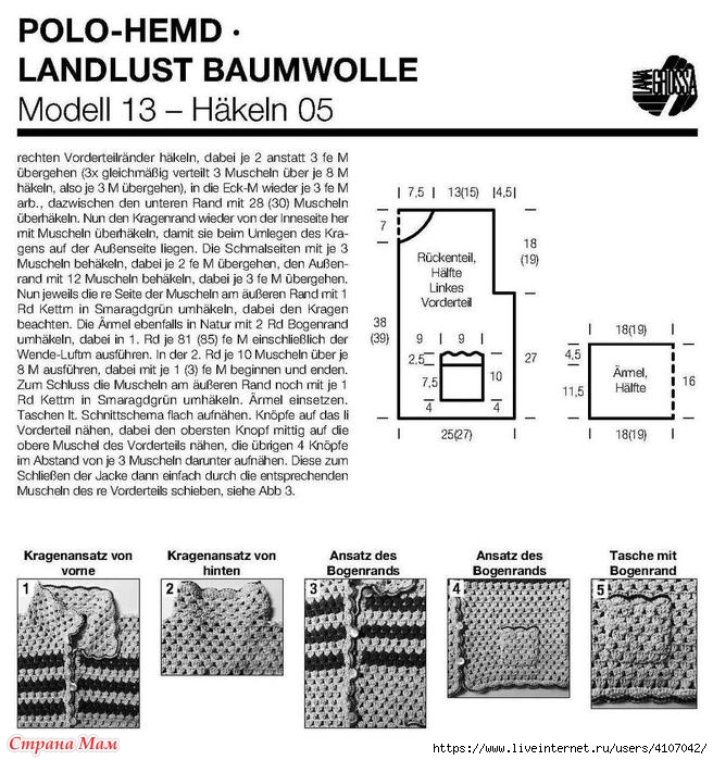 Материал: качественный хлопок Landlust от Lana Grossa (100% (органический) хлопок, LL = ок. 115 м/50 г): ок. 400 (450) г натурального цвета (цвет 3) и ок. 50 г изумрудно-зеленого цвета (цвет 9); 1 крючок для шерсти № 3,5; 5 перламутровых пуговиц натурального цвета, Ø 18 мм.