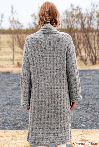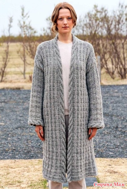 Длинный серый кардиган оверсайз с плетёным узором и планками-косами