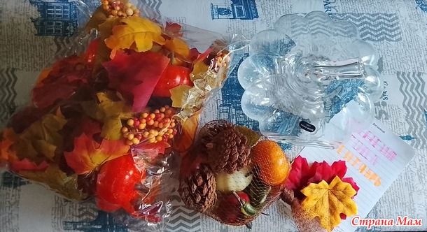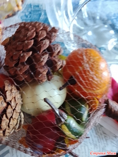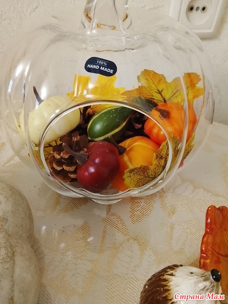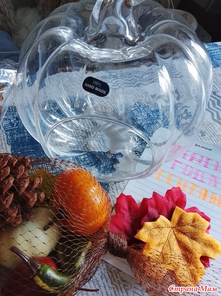 Мой отчёт за сентябрь. Скажите, есть ли у Вас коробочки "Зима", "Очень" и и.д.? С недавних времён в моём доме такие коробочки у меня есть. С каждым годом их содержимое приростает. Когда объявили тему месяца, у меня всё сложилось. И коробочка досталась с антресоли и новые украшения в виде стеклянной тыквы прикупились. Мои материалы: стеклянная тыква, овощи, гирлянды, шишки.