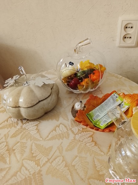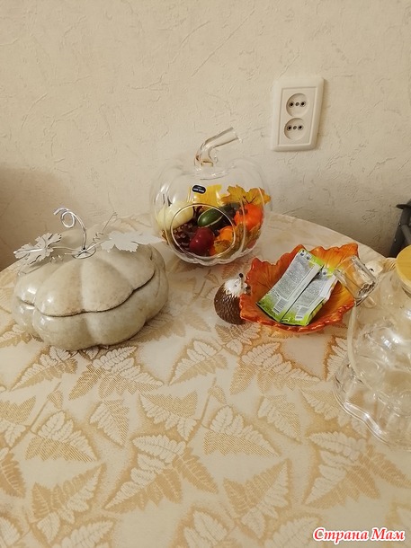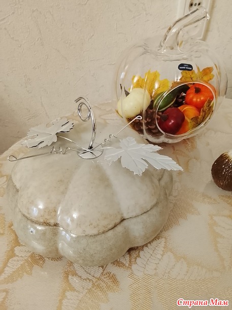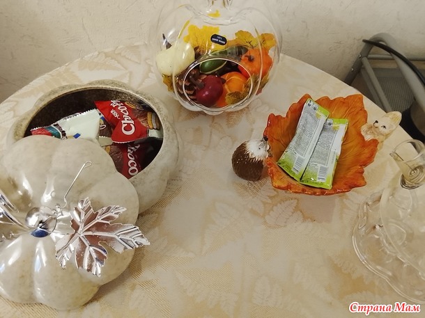 На фото плохо видно, так гирлянда из листочков и тыкв. Тыквы светятся огоньками. Дошло время до настольной тыквы. И вот что получилось, под чутким приглядом Василисы, тыквы мохнатые лапки выбирали.