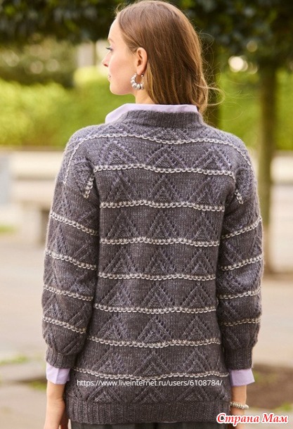 Сборка: выполнить плечевые швы. Для бейки горловины двойной нитью (= по 1 серой и антрацитовой нити) на круговые спицы набрать по бортам и скосам горловины полочек, а также краю горловины спинки 294 (310) п. и связать 5 см = 17 р. узором 1, при этом в 1-м р. (= изнаночный ряд) после кромочной начать с 2 изнаночных, 2 лицевых и закончить в зеркальном отображении.