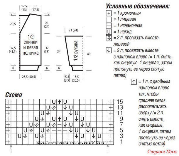 Правая полочка: вязать так же, как левую полочку, но в зеркальном отображении, и для размера 38/40 начать узор 2 после кромочной с последних 10 п. раппорта, при этом в 7-м и 13-м р. схемы вместо провязывания первых 2 п. вместе с наклоном влево провязать только 1 лицевую.