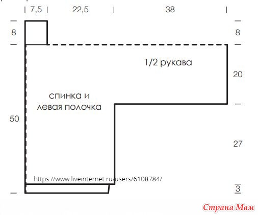 Правая полочка с половиной рукава: вязать симметрично левой полочке с половиной рукава.