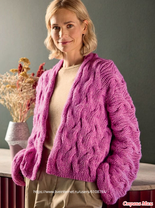 Вам потребуется: 650 г цвета фуксии меланжевой (цв. 29) пряжи Natural Alpaca Pelo (63% хлопка, 31% альпака бэби, 6% шерсти мерино, 125 м/50 г) фирмы Lana Grossa; прямые спицы № 5,5, круговые спицы № 5,5 длиной 120 см.