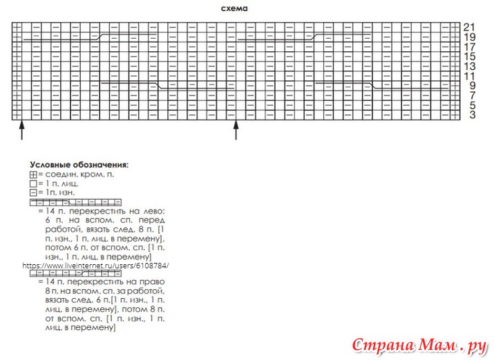 Резинка с косами: вязать по схеме. Цифрами с правого внешнего края обозначены лиц. р. В изн. рядах провязывать петли по рисунку. В ширину начать с петель перед 1-й стрелкой, 22 п. раппорта между стрелками постоянно повторять, закончить петлями после 2-й стрелки. В высоту выполнить 3–22 р. 1х, затем эти 20 р. постоянно повторять.