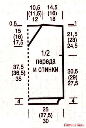 Для скосов горловины закрыть по внутреннему краю в каждом 2-м р. 24 (26) 28 х 1 п. На высоте спинки закрыть оставшиеся по 11 (12) 14 п. плеч.
