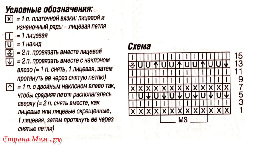 Узор 2 (спицы № 3,5): ажурный узор (число петель кратно 6 + 1+2 кромочные) = вязать согласно схеме. На ней даны лицевые ряды. В изнаночных рядах петли провязывать по рисунку или согласно инструкции, накиды провязывать изнаночными; из 2 накидов подряд 1-й накид провязать изнаночной, 2-й накид — изнаночной скрещенной. Начать с 1 кромочной и петель перед раппортом, раппорт постоянно повторять, закончить петлями после раппорта и 1 кромочной.