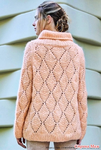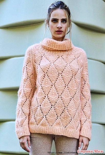 Свитер оверсайз с широким воротником и фактурными ромбами. Спицы.