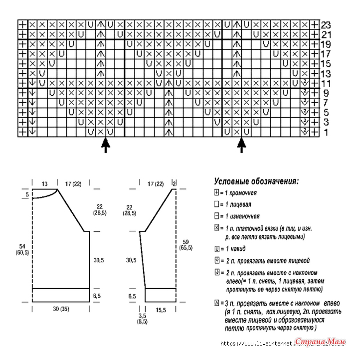 В изнаночных рядах петли вязать по рисунку или так, как указано в «Условных обозначениях», накиды провязывать лицевыми.