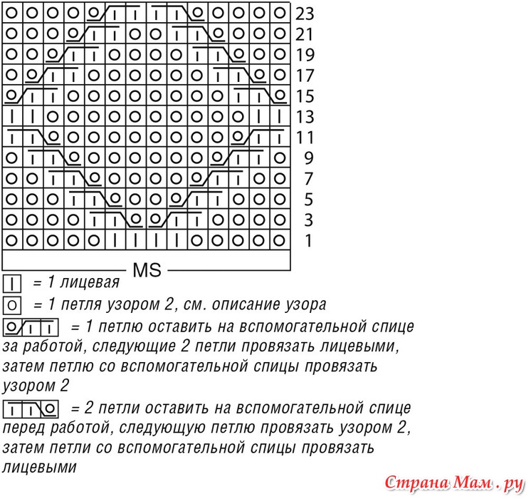 Лицевые ряды: кромочная, * 1 лицевая, 2 изнаночные, 1 лицевая, от * постоянно повторять, кромочная. Изнаночные ряды: петли провязывать по рисунку.